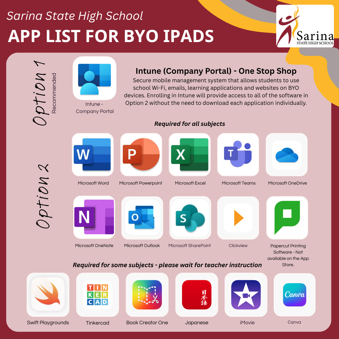 At Sarina State High School, our BYO iPad Program is offered to all students in Years 7, 8 and 9, while our BYO Laptop Program is available to students in Years 10, 11 and 12.