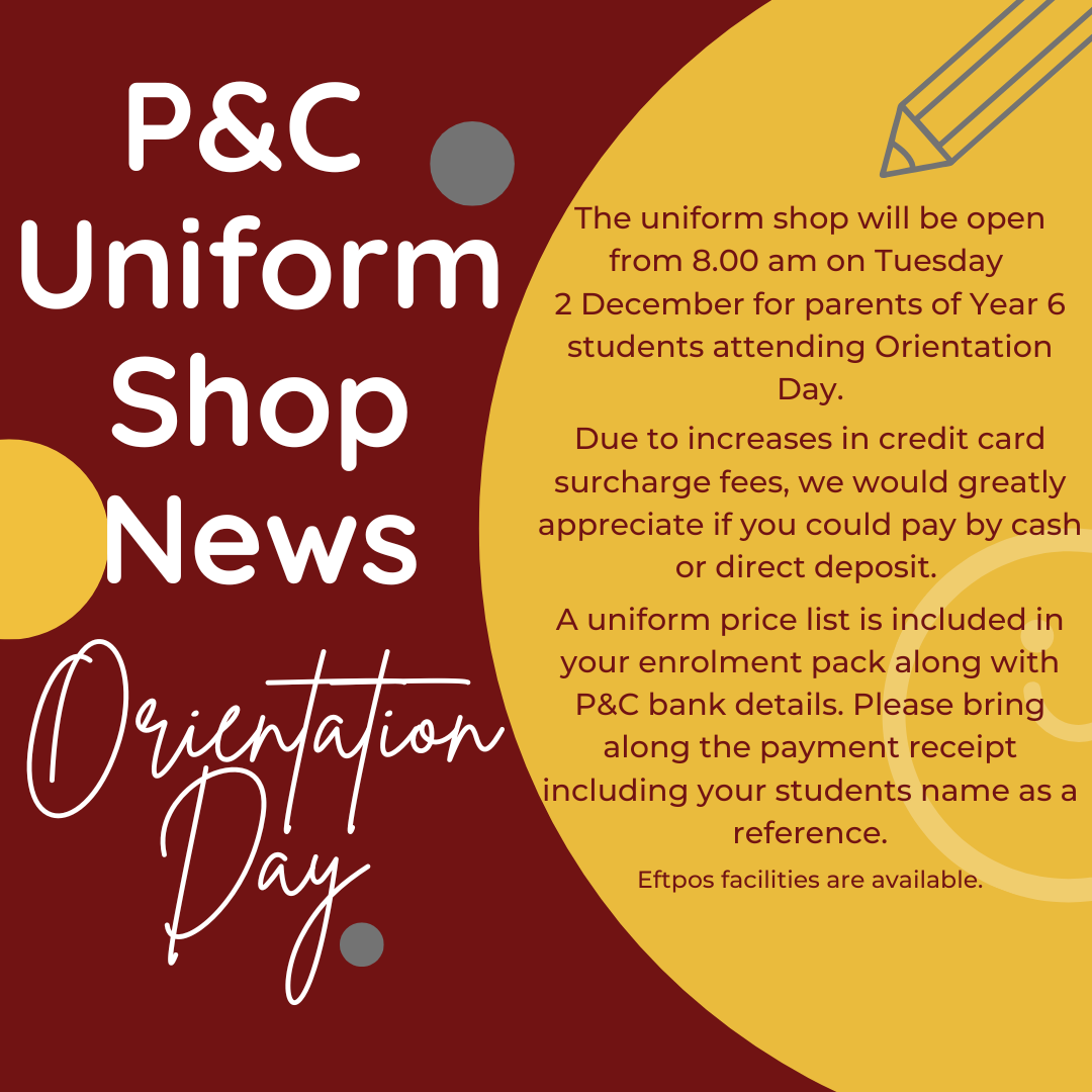 The uniform shop is located behind the tuckshop and can be contacted on (07) 4943 8162 during opening hours or you can leave a message.