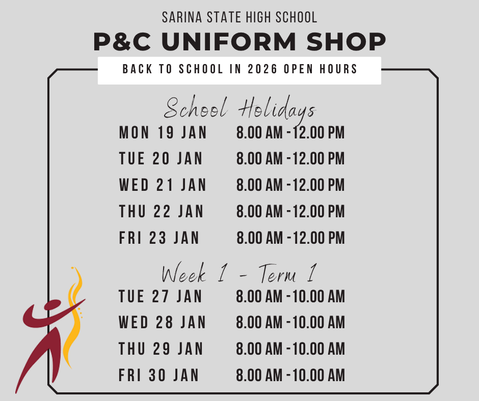 The P&C Association Uniform Shop carries the full range of uniforms necessary for your student to attend Sarina State High School. All compulsory uniform clothing items are stocked and we have worked hard to ensure that the uniform is functional and affordable.
